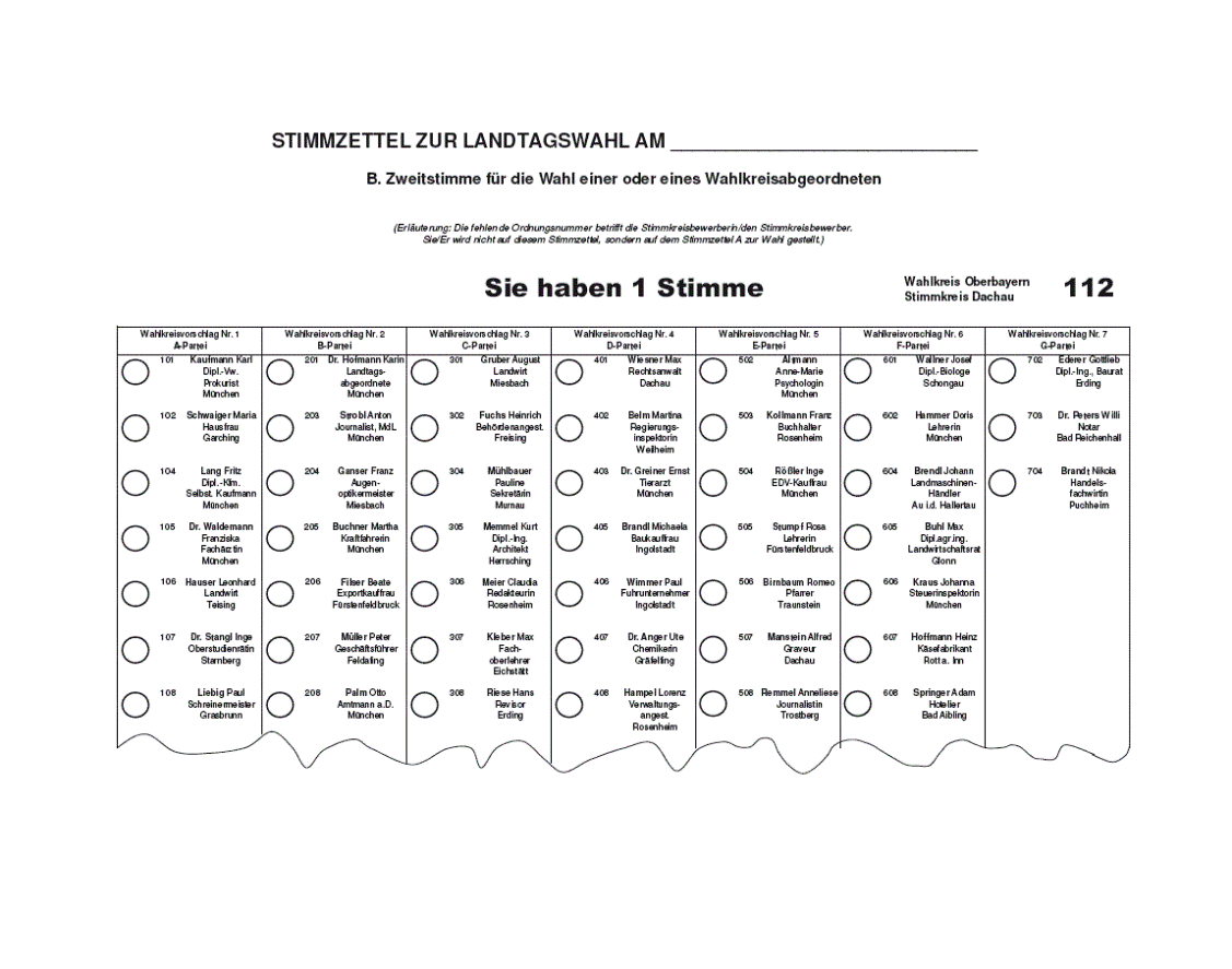 Familienname vorname beruf oder stand. Das ist der stimmzettel bei der landtagswahl 2018 in bayern. Die musterstimmzettel musterwahlzettel zur bundestagswahl 2013 werden derzeit von zuständigen kreiswahlleitern veröffentlicht.